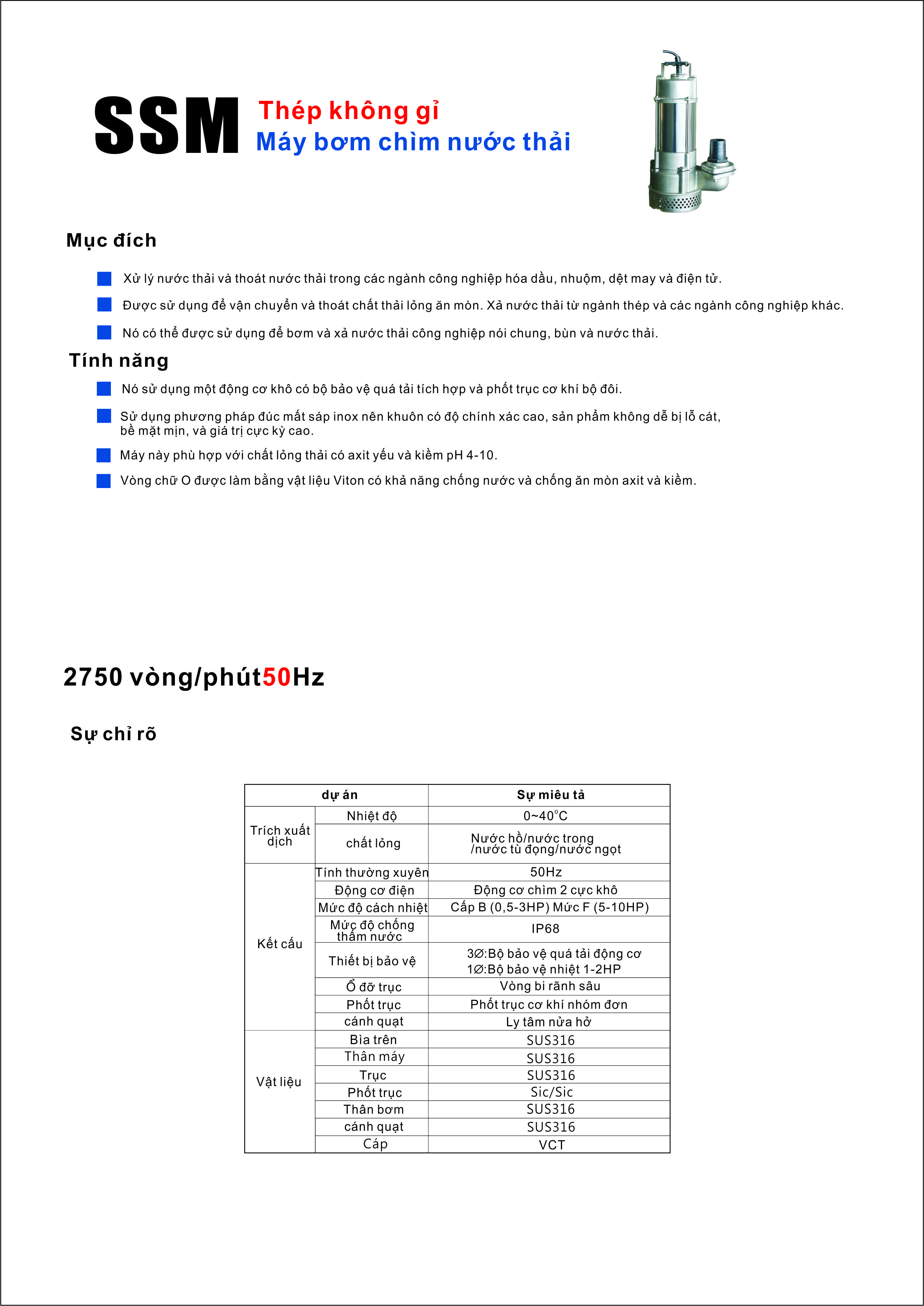 Tính năng ■Nó sử dụng động cơ khô có tích hợp khí bảo vệ quá tải và phốt trục cơ khí bộ đôi. ■Sử dụng phương pháp đúc khuôn bằng thép không gỉ, khuôn có độ chính xác cao. Sản phẩm không dễ bị lỗ cát, độ nhẵn bề mặt tốt, có giá trị cao. ■Máy này phù hợp với chất lỏng thải có axit yếu và kiềm pH 4~10.
